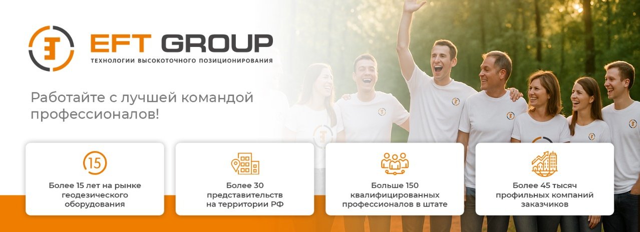 EFT GROUP занимается поставками современного геодезического оборудования. Наша команда объединяет целеустремленных профессионалов, увлечённых инновациями в сфере геодезических технологий. Мы обеспечиваем клиентов качественным оборудованием, предоставляем компетентную техподдержку и комплекс услуг сервиса. Если вы разделяете наши ценности и готовы вместе достигать новых высот, ждём вас в нашей команде!